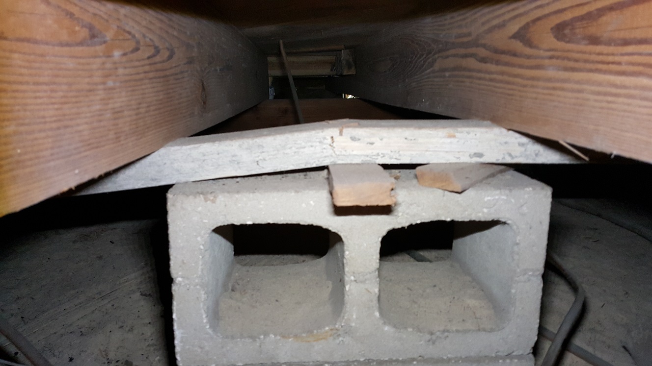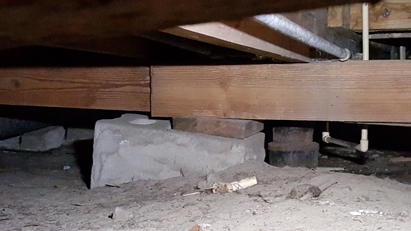 Looking at that pier under the area where the floor and the wet wall have settled, I can clearly see why. The pier has somehow managed to shift and lean downhill towards the old cast iron plumbing, right around where it was supposedly leaking, so right away I'm thinking the leak is much worse than we thought. On second thought, it looks like it's been that way for quite some time, as if the someone that found it that way figured chucking a chunk of wood between the block and the beams would be better than doing nothing at all, which was obviously their first choice. That would have been the someone that replumbed the bathroom, the cause of the leak to begin with, so something else must be going on here.