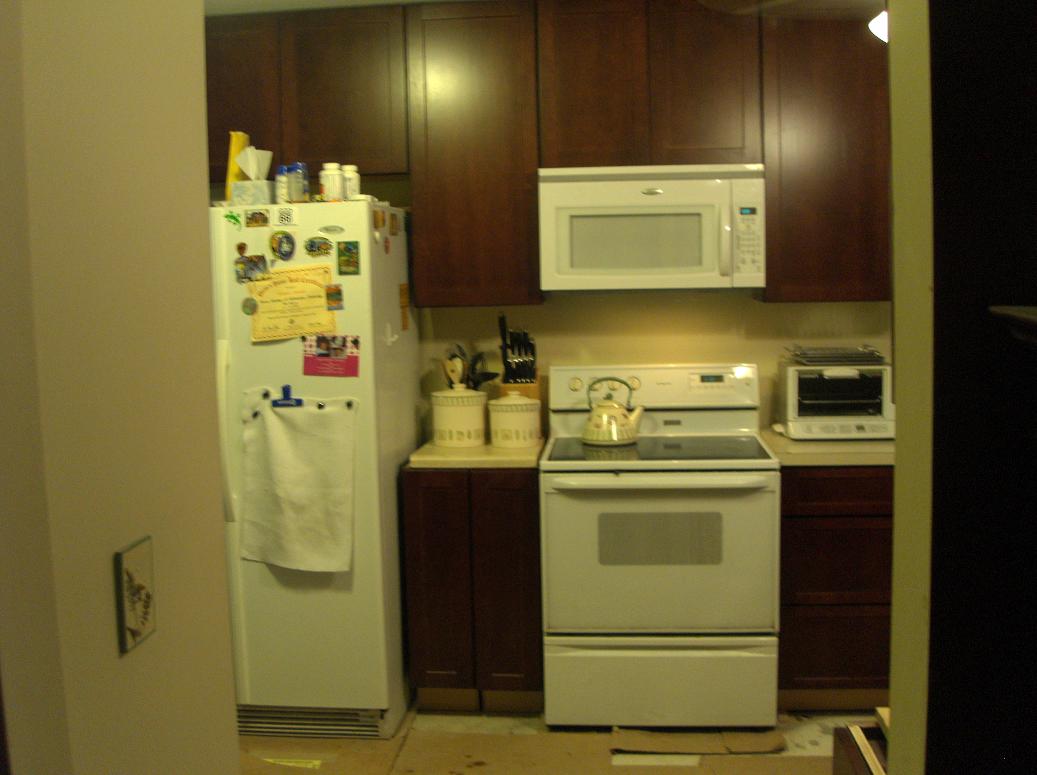 I don't want to start bitching about what wasn't done right or wasn't done to my liking... Well, actually, yes I do. But I'm not going to. It's not going to help with telling the story now, looking back years later. For most of this, I captured the "drama" as the story unfolded, so the details were fairly fresh in my mind. Unfortunately, I have a tendency to jump in and start doing and demolishing things before I remember to take before pictures, as is the case here. My before picture is one of Nick making a funny face with the view of the kitchen before in the background. You'll notice how close the ceiling looks to the top of the door frame and how small it feels. What is not captured by this picture is the recessed flourescent lighting fixtures and how much the entire structure is just wasted space.