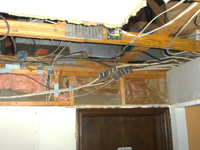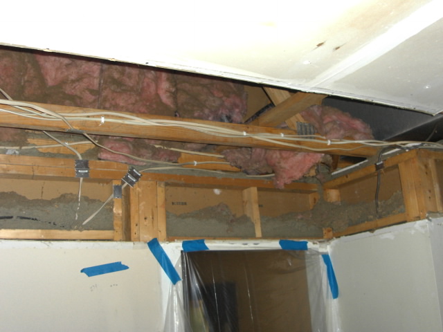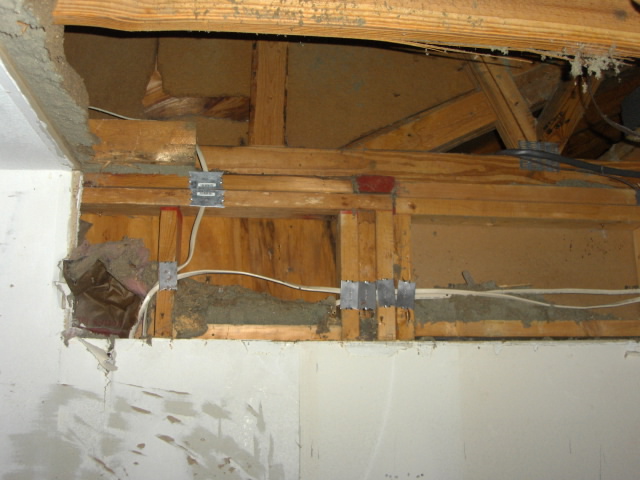 Once all that is done, they start to add the 'nailers' they will need to hang the new drywall - short lengths of 2x4 to give support to the drywall, something to nail the edges of the drywall to. Quinci reminds me I may want to get some placement pics while the walls and ceiling are still open, so now would be the time since next week she and Nick will be installing the new drywall.