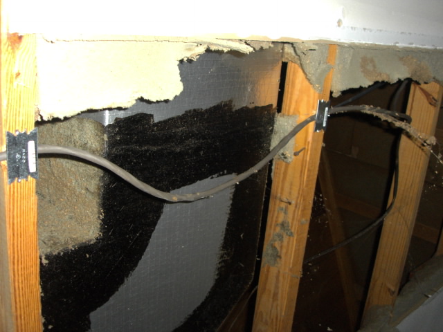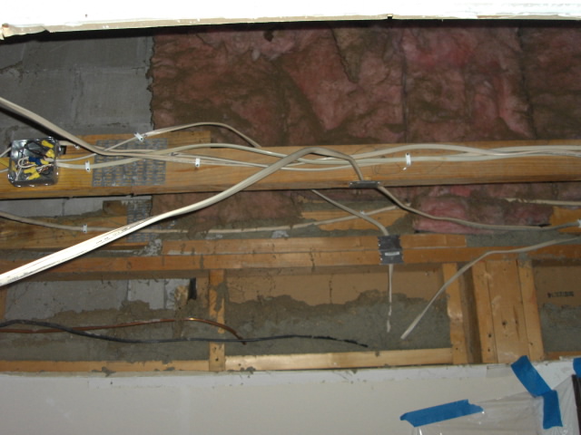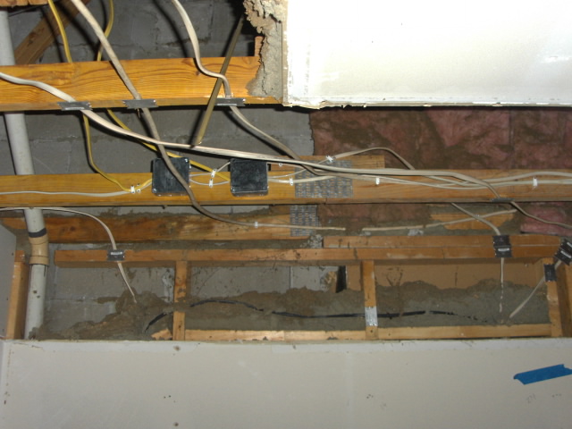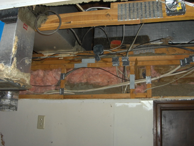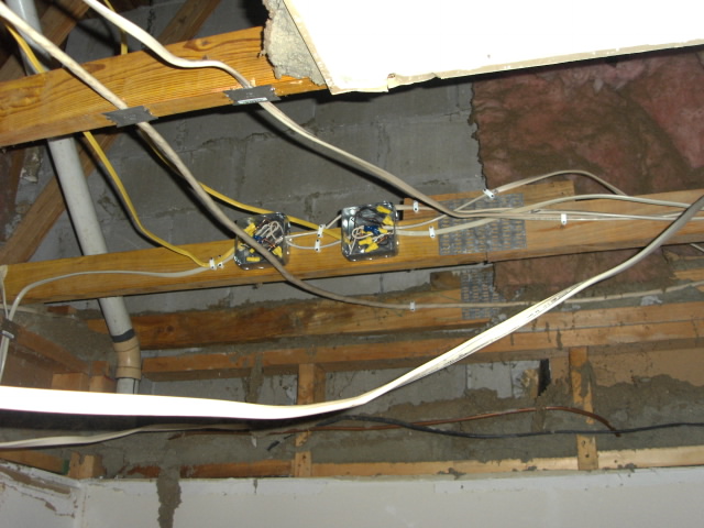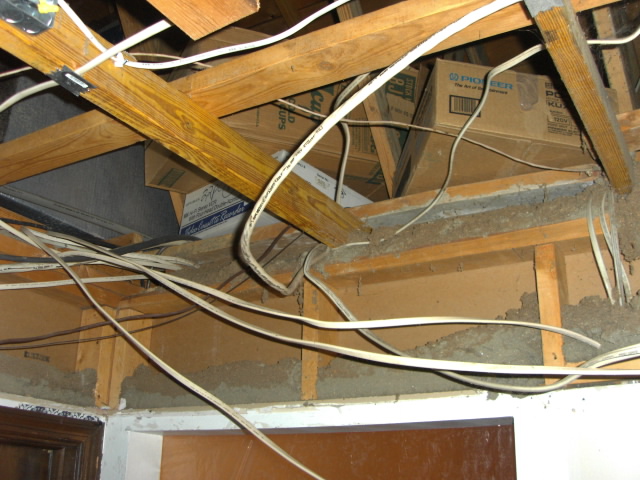I have to head into work after the first day so Nick and Quinci are on their own. At least two extra days, another box of 14/2 wire, most of the rest of my box of 12/2, a ten foot chunk of 10/3, many new work electrical boxes, wire splices, 'staples' and nail guards later, the electricity to the kitchen is restored. Looking back I wish I would have just had her run new wire, since she had to splice pretty much everything anyway, but I can't really justify it with anything but a 'perfectionist' desire to do it right. The cost really doesn't matter, it was going to cost more regardless of how she did it, at the time the real motivation is the gigantic open air access to the attic and the increasing filth from blown insulation accumulating in the rest of the house. I just want that huge, gaping hole into the attic closed up! Running all new wire would just take that much longer to finish.