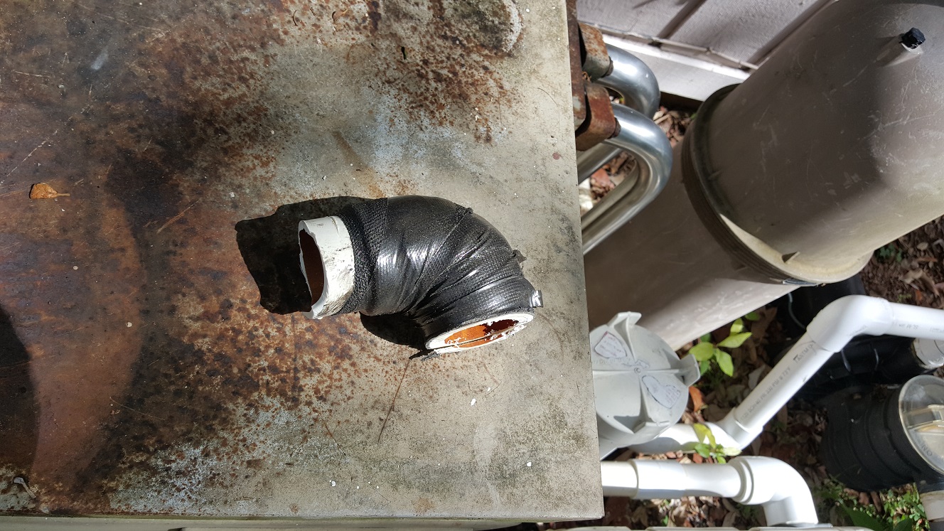 That's when I notice the new "Jandy" valve where the old gate valves used to be. I ask if Nick had done that when he fixed the cracked plumbing last time or if it was the pool guy Ann had to fire. It was the pool guy, but I notice that there is new plumbing to the old "Jandy" valve on the suction side. Normally that wouldn't be that much of a revelation, after all, it is new plumbing. What draws my attention is the fact that the old plumbing used to have an elbow that went right into that valve, into being the keyword here. Not onto, like the new plumbing elbow that now fits over the outside of the old valve, as in onto it.